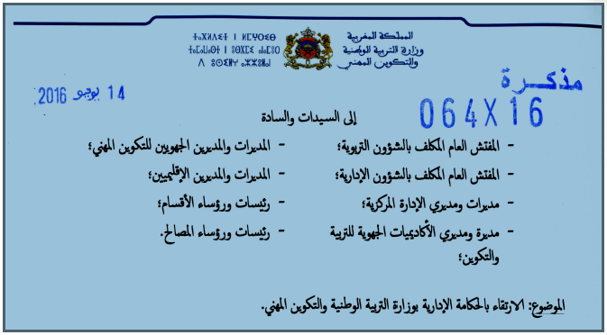 اقرأ المزيدالمذكرة رقم 064-2016 بتاريخ 14 يونيو 2016 حول الارتقاء بالحكامة الإدارية بوزارة التربية الوطنية والتكوين المهني.
