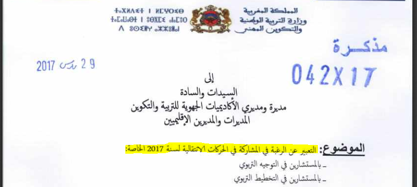 مذكرة رقم 047-17 بتاريخ 30 مارس 2017 في شأن مباراة الدخول إلى سلك تكوين أطر الادارة التربوية وأطر هيئة الدعم الاداري والتربوي والاجتماعي بالمراكز الجهوية لمهن التربية و