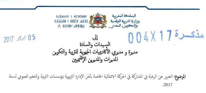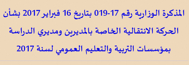 مذكرة رقم 17-019 بتاريخ 16 فبراير 2017 بشأن الحركة الانتقالية الخاصة بالمديرين ومديري الدراسة بمؤسسات التربية والتعليم العمومي لسنة 2017.