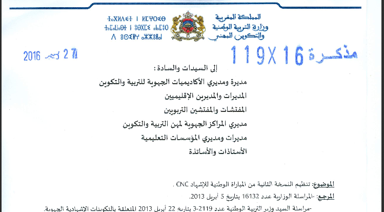 اقرأ المزيدمذكرة رقم 16-119 بتاريخ 27 دجنبر 2016 بشأن تنظيم النسخة الثانية من المباراة الوطنية للإشهاد CNC.