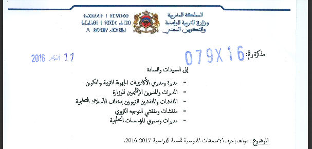 اقرأ المزيدمذكرة رقم 16-079 بتاريخ 11 أكتوبر 2016 بشأن مواعد إجراء الامتحانات المدرسية للسنة الدراسية 2017-2016